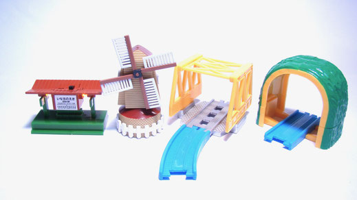 ストラクチャ(情景)は「光る田舎の駅」「風車」「鉄橋+曲線レール」「トンネル+直線レール」の4種です。江ノ電500形の後部車と江ノ電300形後部車にちいさな大仏さまが付属しています。